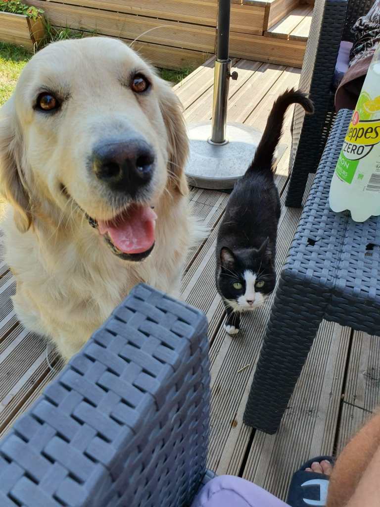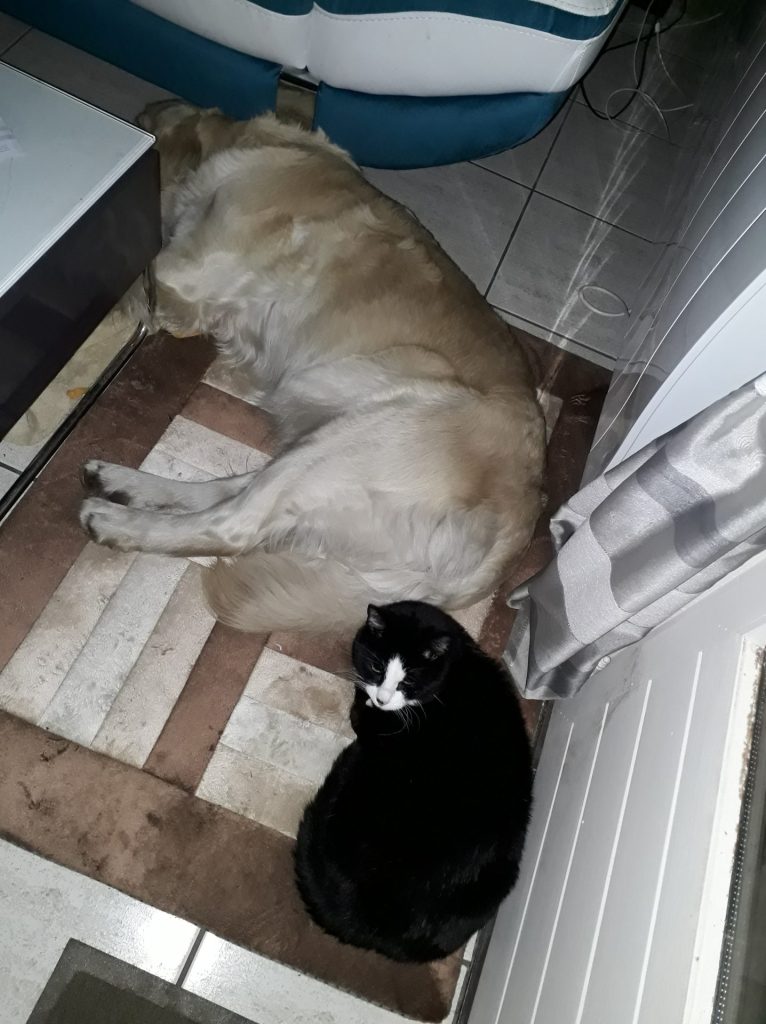 Depuis six ans, Kitty vit avec Ma Golden Retriever ! Maïa a compris désormais que jouer avec Kitty n’était pas gagné d’avance … Alors elles se croisent, se regardent en toute courtoisie ! et dorment côte à côte de rares fois …