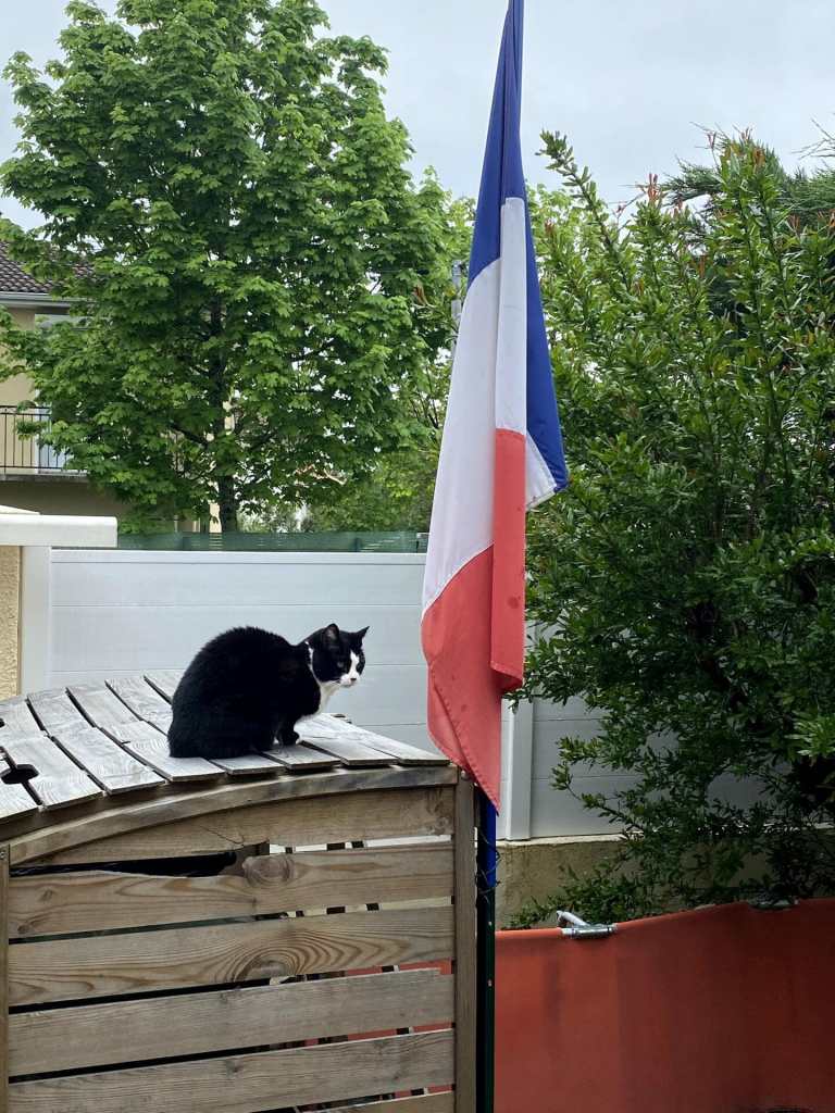 Kitty Pose devant le drapeau, la télé et sur un arbre !