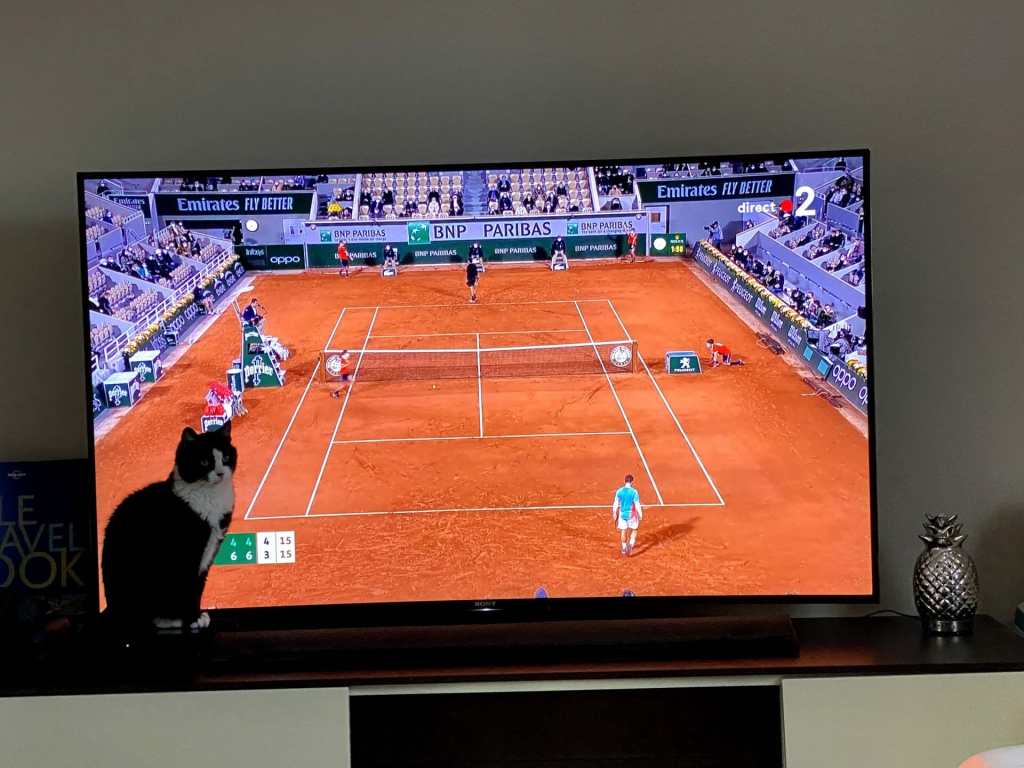 Le chat est bien plus agile que le chien.. Alors nous retrouvons souvent Kitty dans de drôles de positions ! Ainsi, vous la verrez au garde à vous , sur un arbre perché et devant la télé en arbitre Internationnal de Tennis !